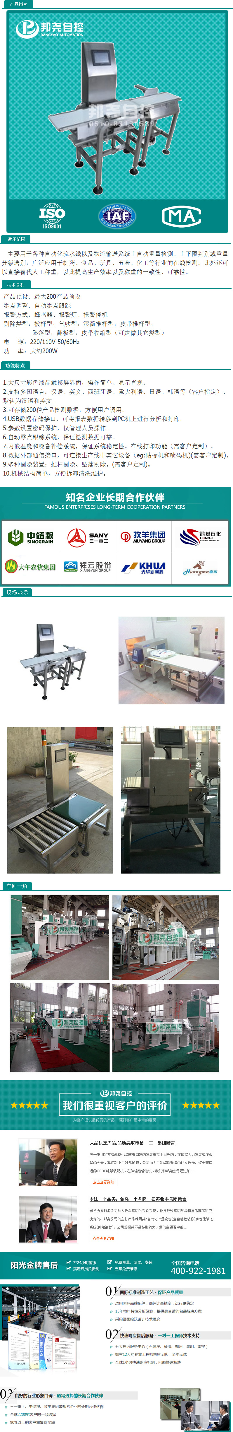 重量選別機又叫重量分選機,在線檢重秤,是一種應(yīng)用于各種自動化流水線以及物流輸送系統(tǒng)上的自動重量檢測、上下限判別或根據(jù)重量檢測產(chǎn)品是否合格的高科技自動化分選設(shè)備。廣泛應(yīng)用于制藥、食品、玩具、五金、化工、汽車配件等行業(yè)的在線檢測。此外,還可直接替代人工稱重,以達到提高生產(chǎn)效率,提高準確度和山少人工,降低成本的目的。